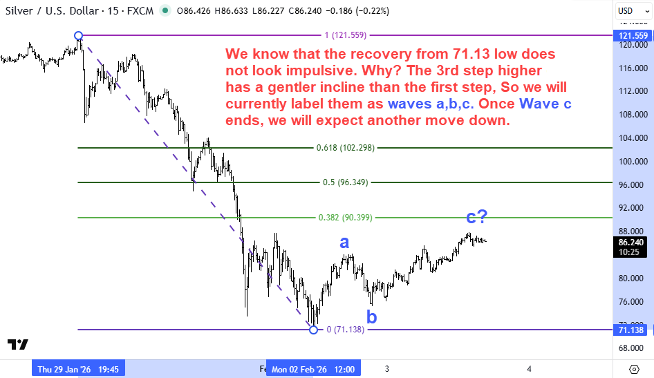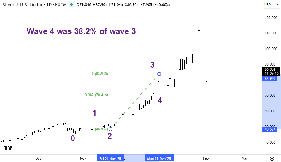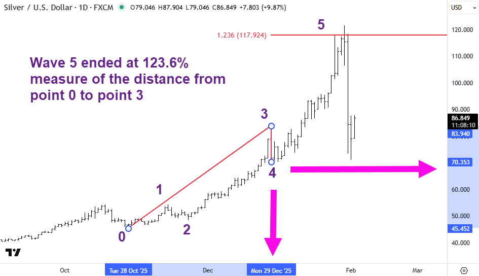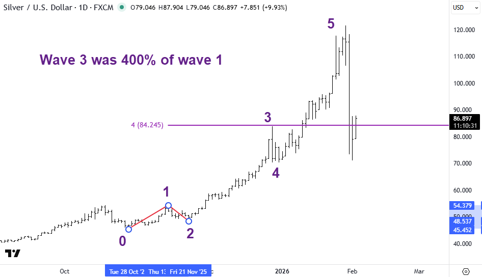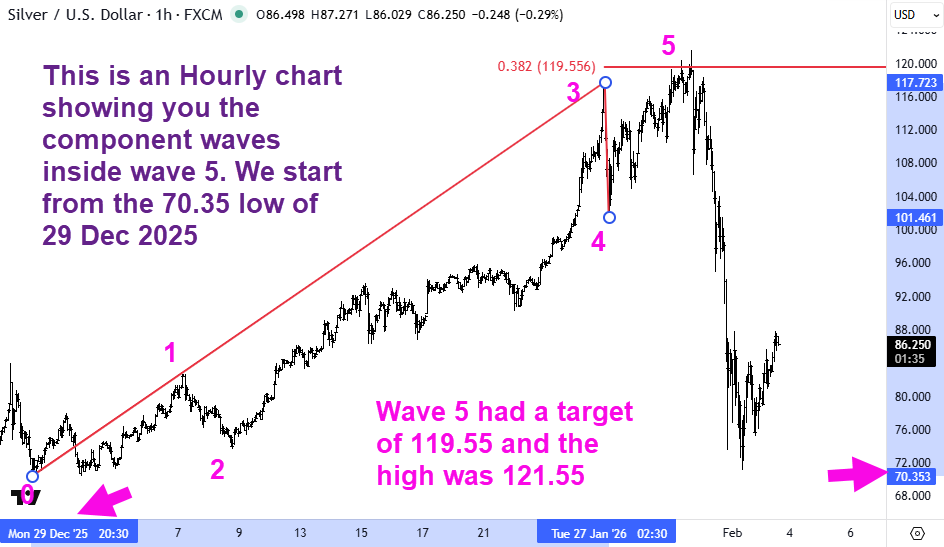 We start our wave count from the significant low of $45.45 seen on 28 Oct 2025. You can see the dates where I have placed the cursor highlighted on the X-axis and the corresponding price on the Y-axis.